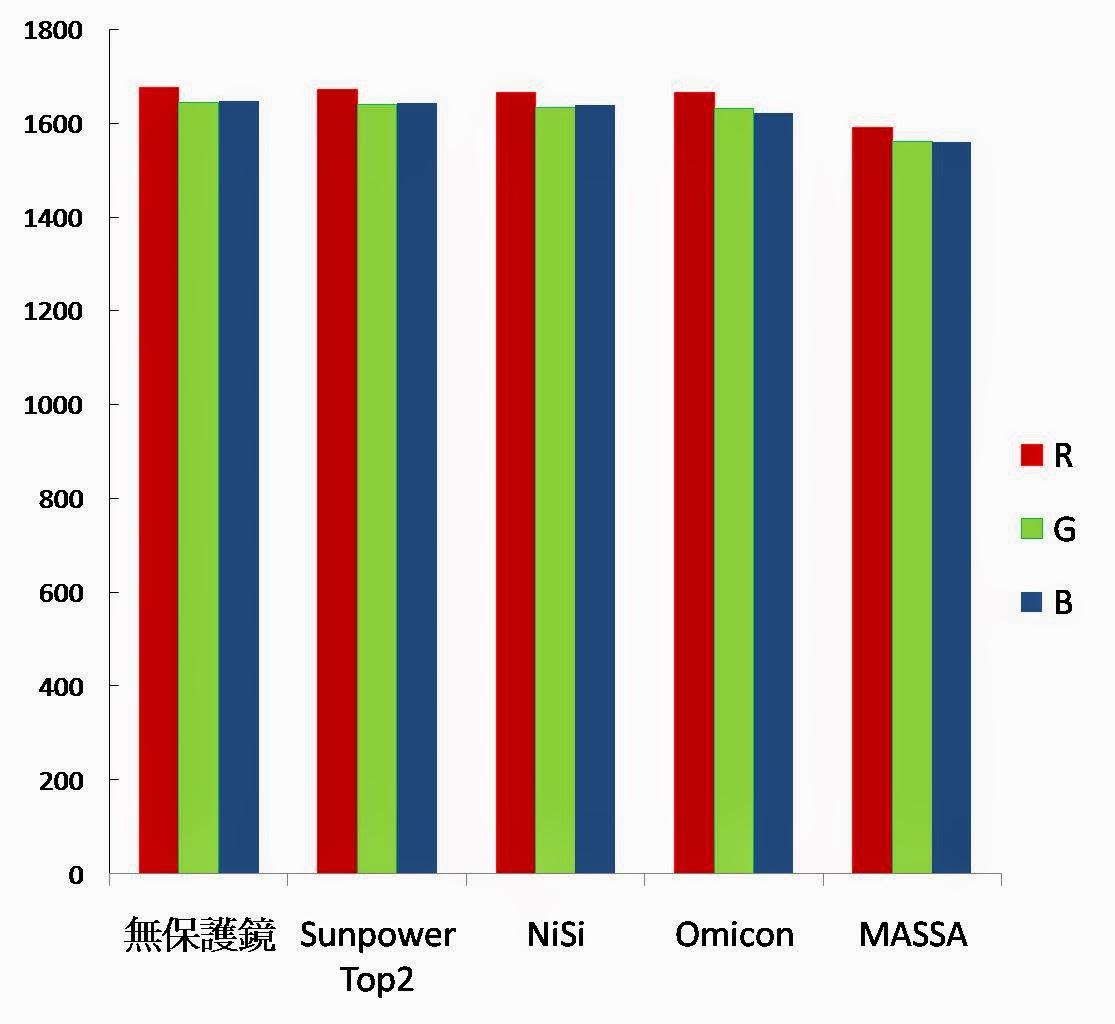 將分析各保護鏡影像後RGB的數值分別和無保護鏡的數值進行計算,sumpower,Nisi,Omicon等三款透光率都有99%以上。(MASSA本來就是買鏡頭送的,不期待他的表現。) |