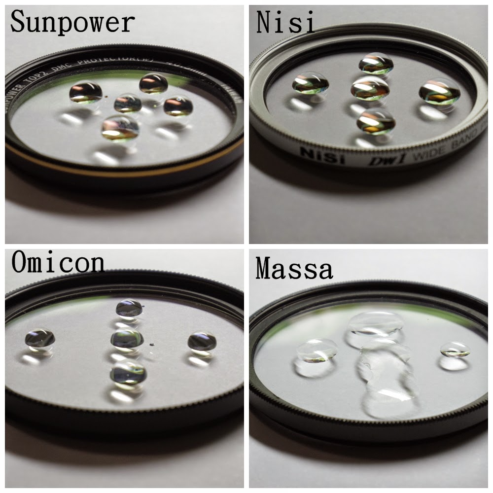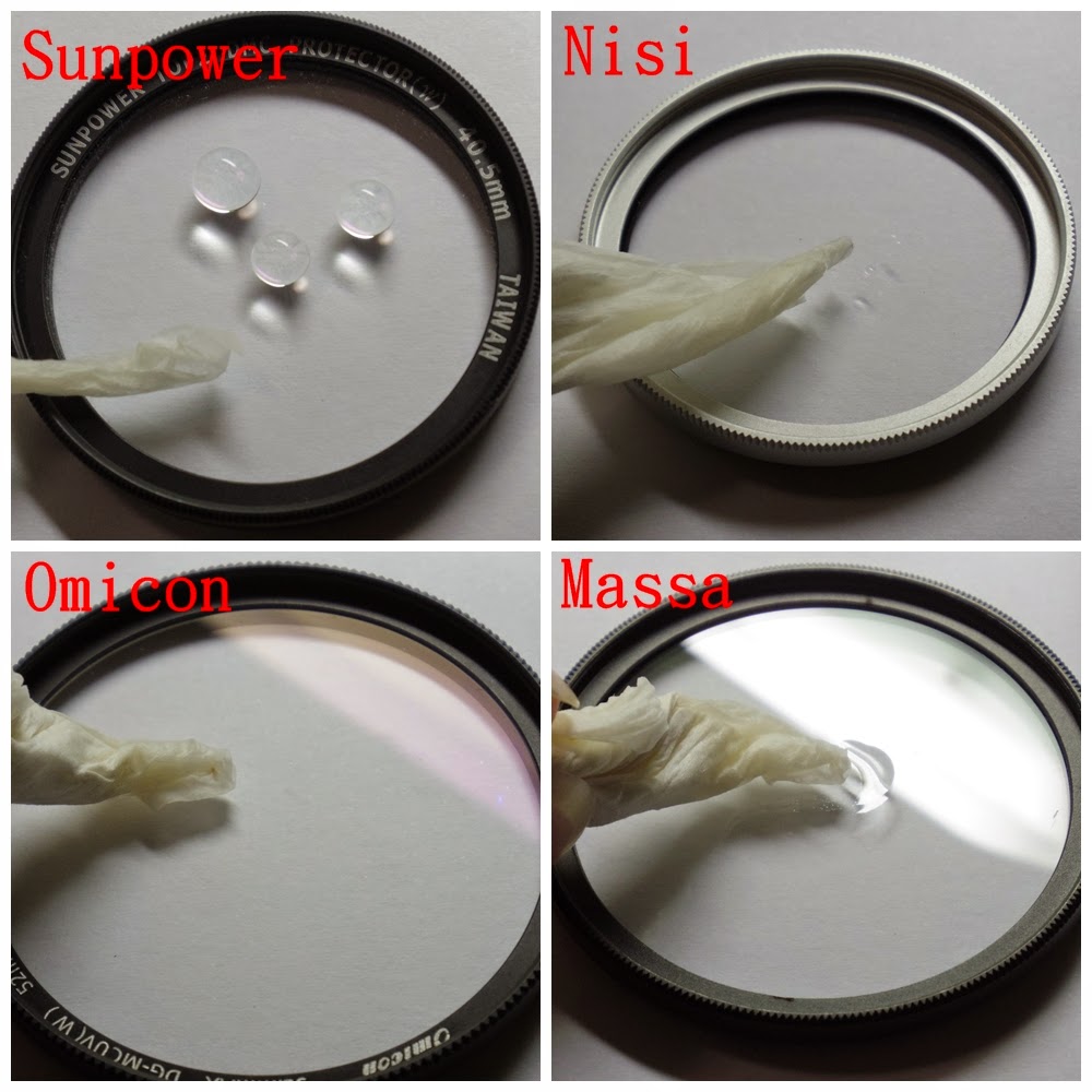 將水以滴管滴在保護鏡上各五滴,Sunpower和Omicon水珠聚集無擴散,Nisi水珠聚集但有稍微擴散,水珠MASSA幾乎不聚集呈現散開狀況。