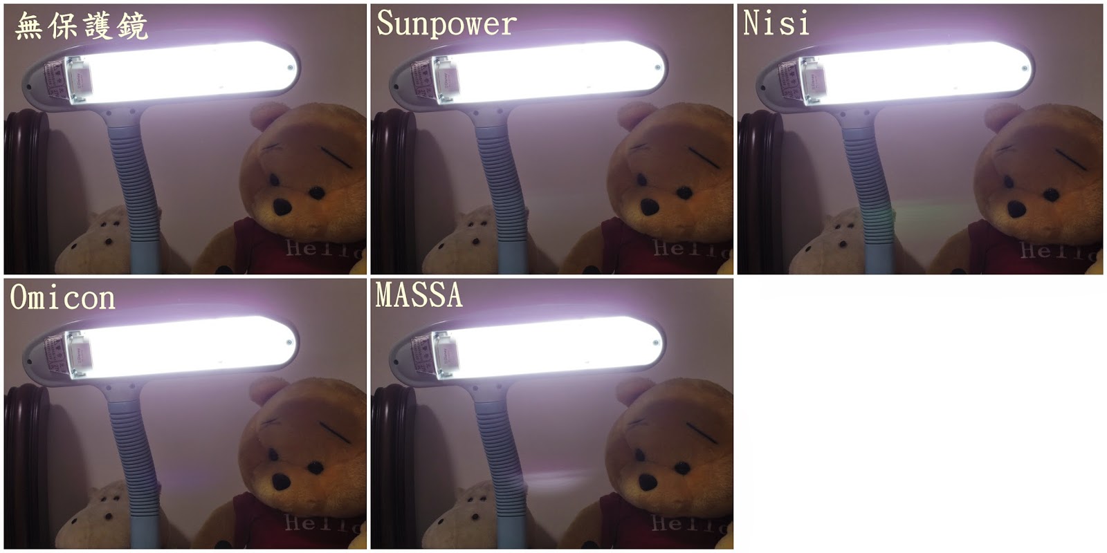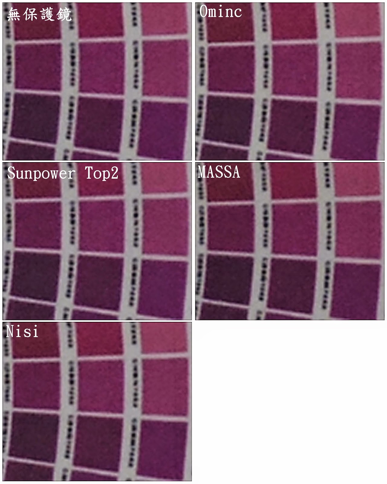 各保護鏡下拍攝圖,看起來無太大差異。 |