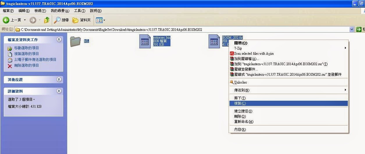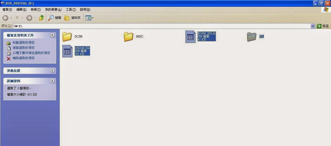 4.然後把SD卡取出後,再把在Magic Lantern抓到自己型號的程式解壓縮後複製到SD卡中