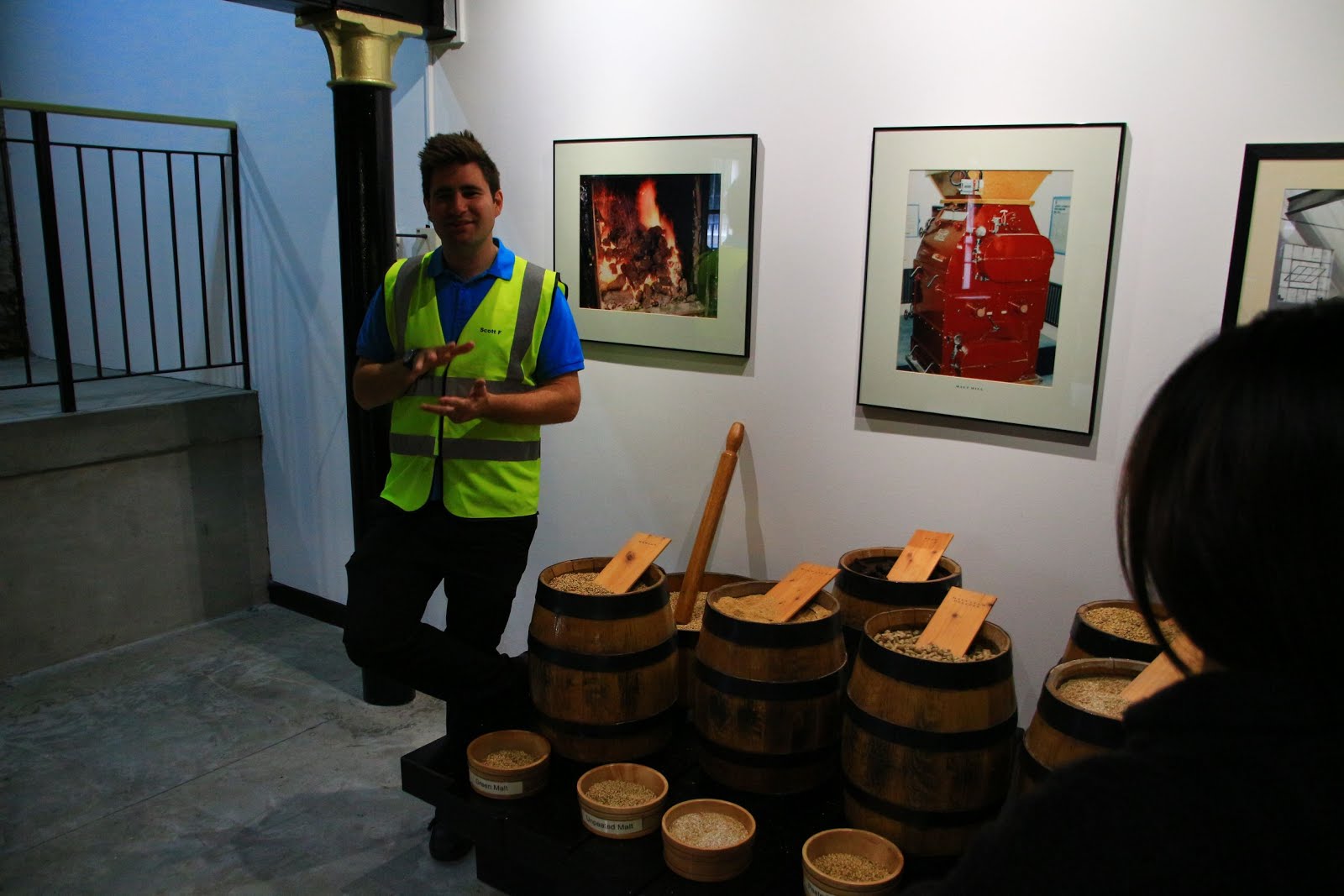 大概等10多分鐘後就開始導覽,導覽員從各種時期不同處理程度的麥子開始介紹,並且拿給大家觀看與細細的分辨它的味道,另外也有威士忌的靈魂泥炭可以聞香,說真的泥炭的味道跟威士忌裡的泥炭味非常的不一樣,可以說是威士忌裡的泥炭味擷取的泥炭的精華味道比較純粹。解說員在解說時看到我們就問我們說是哪裡人,我們說台灣來的他馬上說他知道台灣,因為台灣是蘇格蘭威士忌第三大出口國而且Glen Ord Distillery這威士忌酒場生產的酒剛好是提供亞洲區(包含台灣的酒廠)。