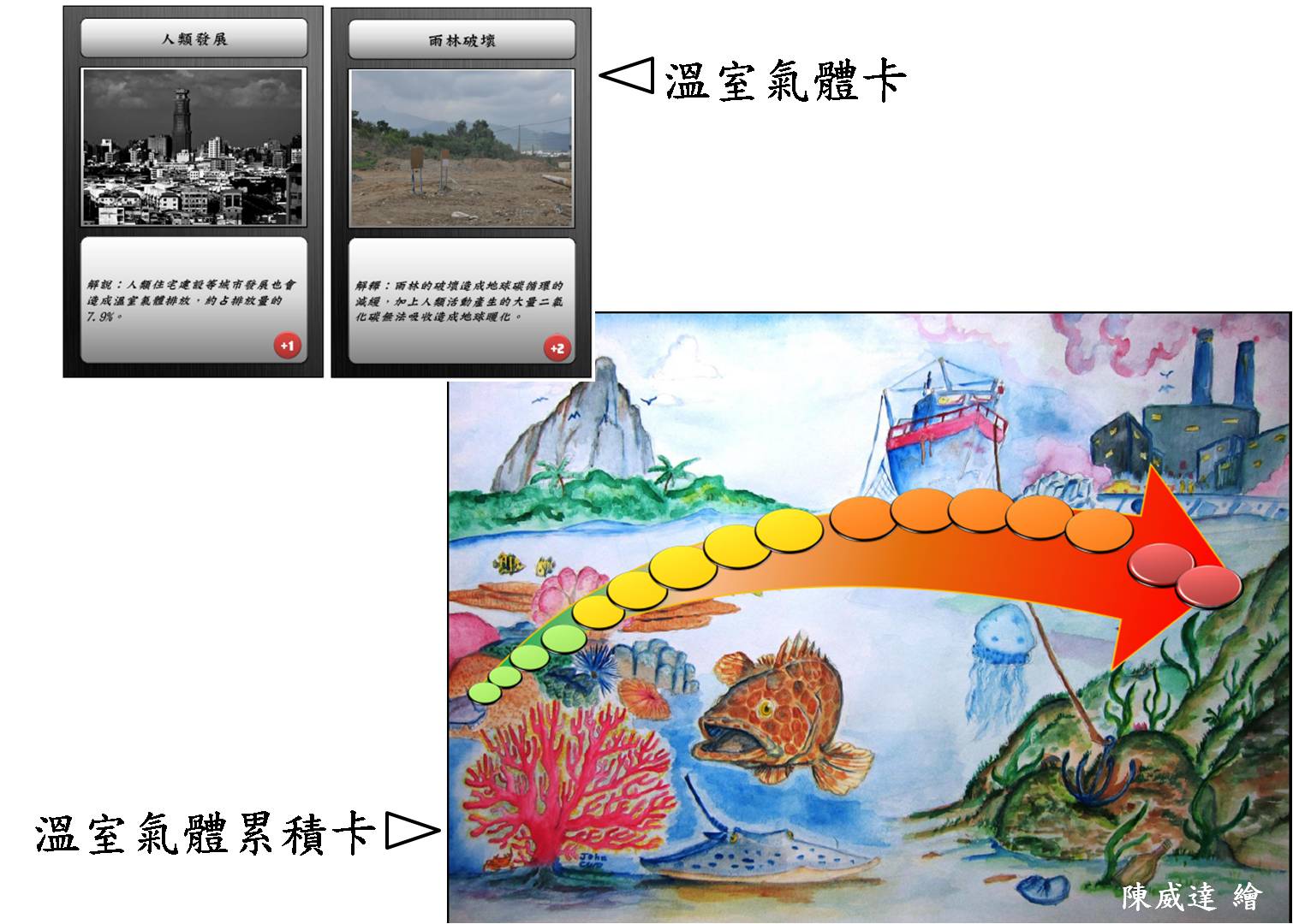 第三版的出現是因為國立海洋科技博物館在友人的推薦下知道我設計的這款遊戲,因此邀請我參與他們的教案討論與八斗子國小潘建祿主任和海科館葉佳承博士。在第一次到海科館進行示範後,對於這款遊戲的時間長度, 複雜度和施行目標提出是否可修改為較簡單易上手複雜度較低的版本。於是第三版中移除溫室氣體累積的設計但是還是保留溫室氣體累積卡,將其改成直接加乘於環境因子上。