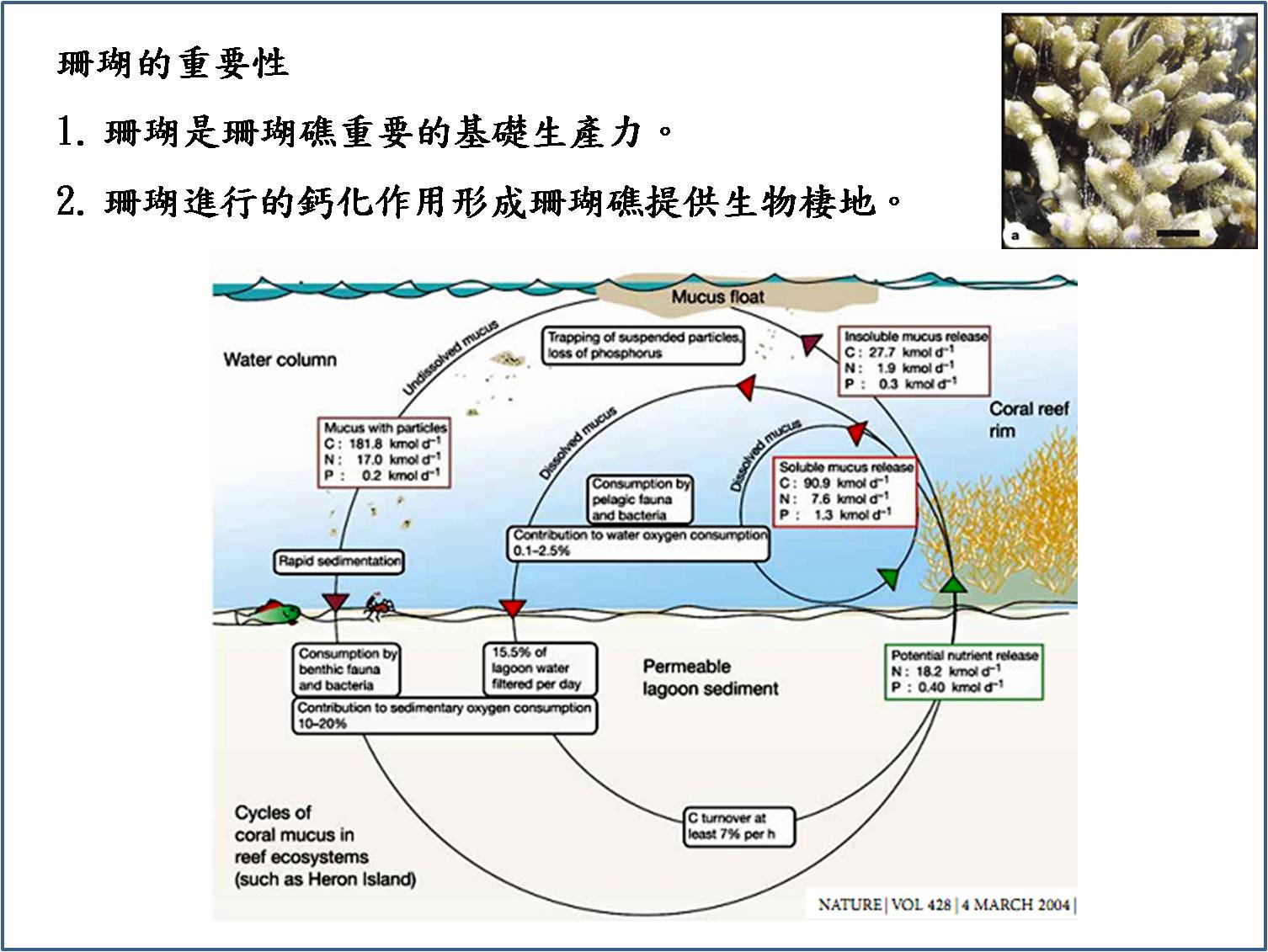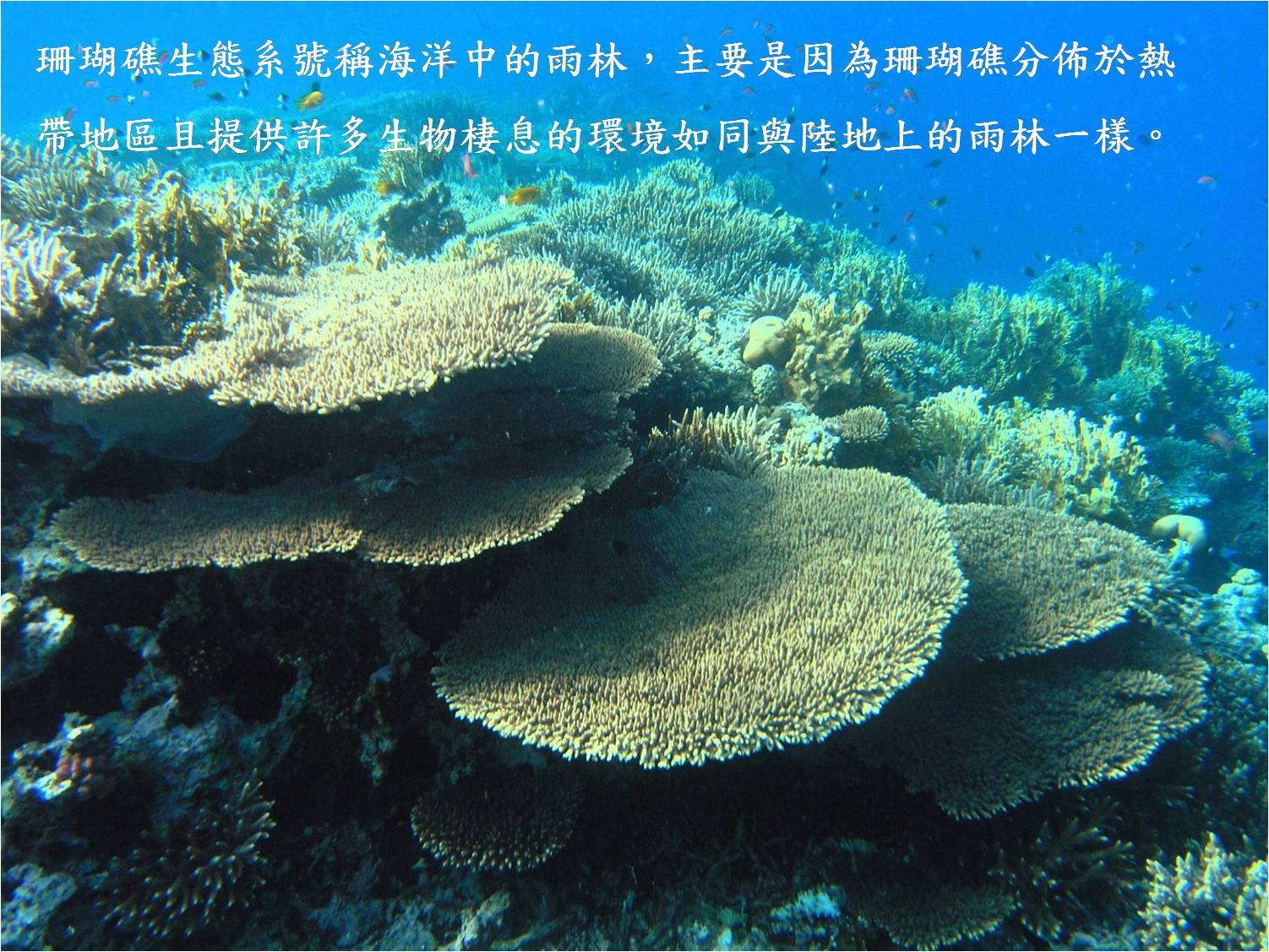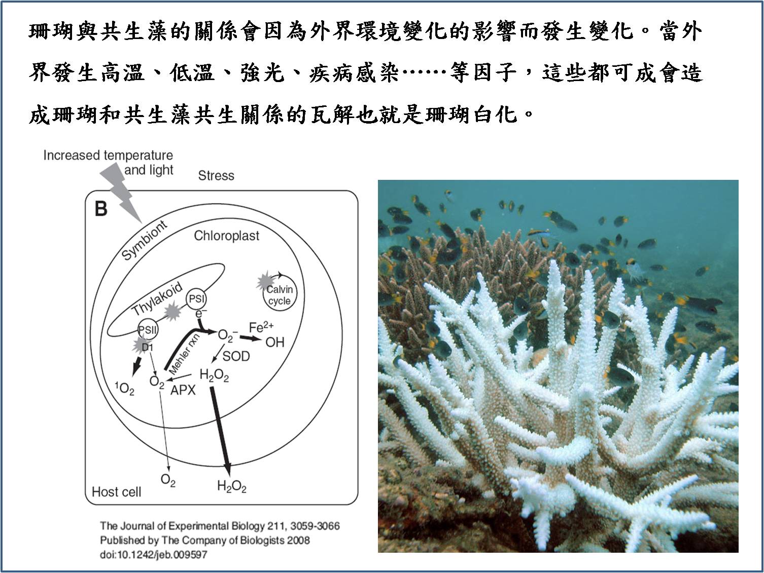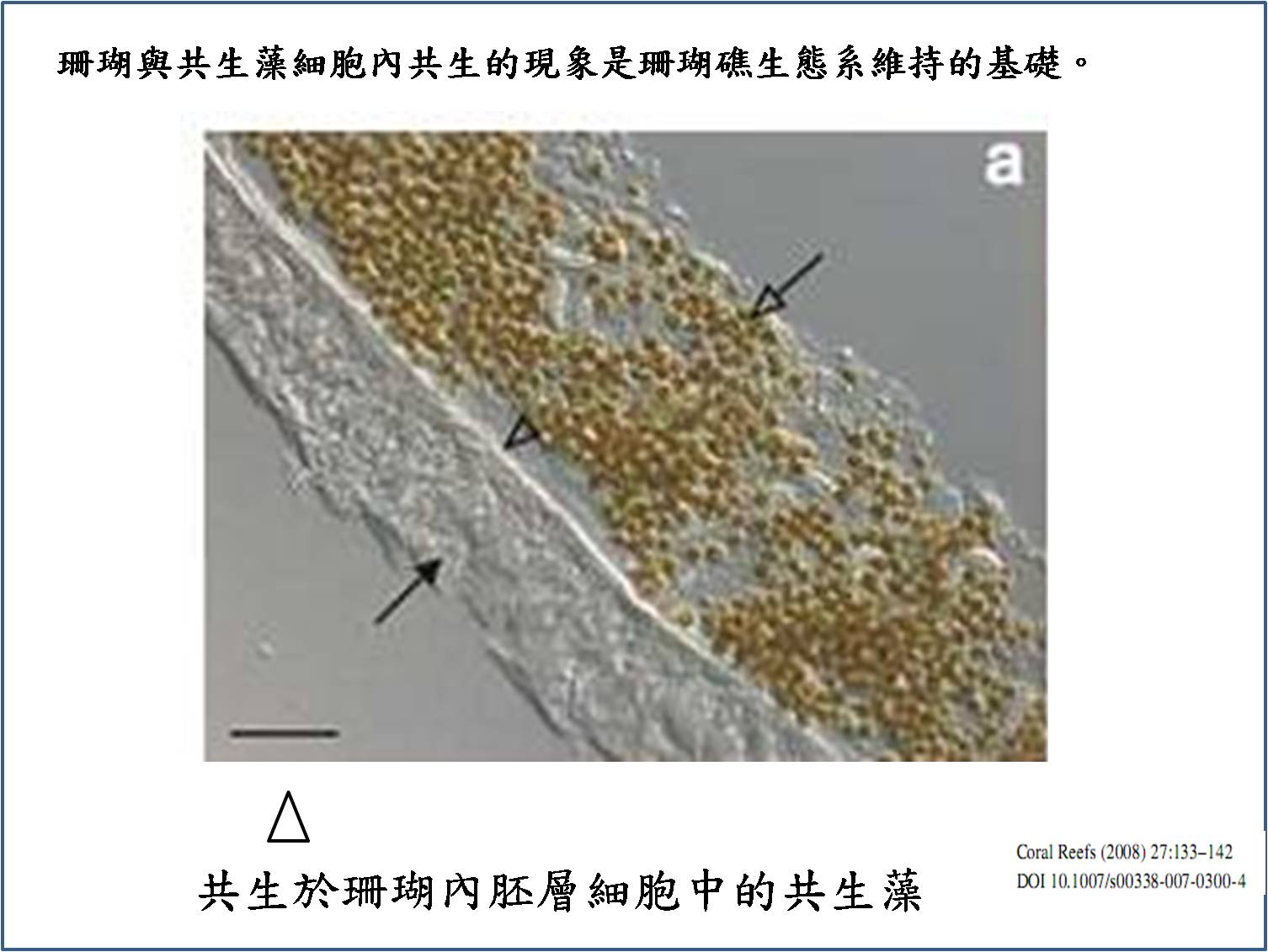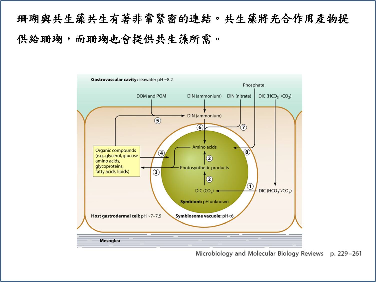 珊瑚礁生態系是地球上重要的生態系之一,有人形容珊瑚礁生態系就像是海洋中的雨林一樣。生長在珊瑚礁的珊瑚是一種雙胚層的刺細胞動物,在珊瑚的內胚層細胞會與一種稱之為共生藻的海洋渦鞭毛藻進行特殊的細胞內共生,共生藻與珊瑚共生有著非常緊密的連結,共生藻在珊瑚細胞內時珊瑚會提供共生藻所需要的營養 (例如:含氮、磷…等生存所需物質和光合作用所需要的二氧化碳),此外共生藻也會進行光合作用並且將高達90%左右的光合作用產物以各種形式 (醣類或脂質)傳送到珊瑚中提供其生存所需。