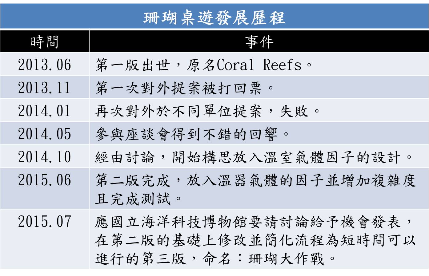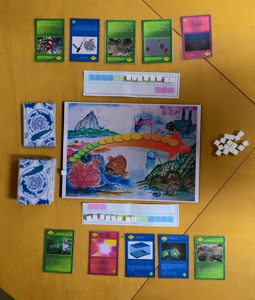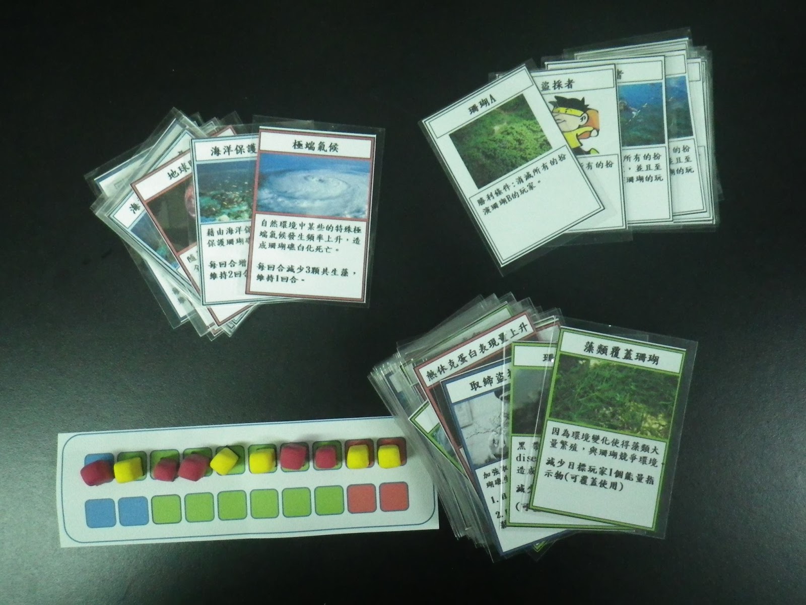 關於這個遊戲的緣起是因為之前我所研究的領域就是關於珊瑚相關的議題,雖然珊瑚白化這個議題是個重要關於環境的議題,但當我在跟其他人聊天時往往無法引起共鳴或是一知半解。因此我就在想用什麼方式可以讓大家在沒有壓力中了解這個議題並且得到相關知識,這時候我想起以前喜歡玩的外文卡牌遊戲,為了玩我居然自主的去認識上面英文單字並了解其規則,所以我就開始規劃設計一款關於珊瑚相關議題的桌遊,希望可讓大家在沒有壓力,歡樂下在不知不覺中得到相關資訊。