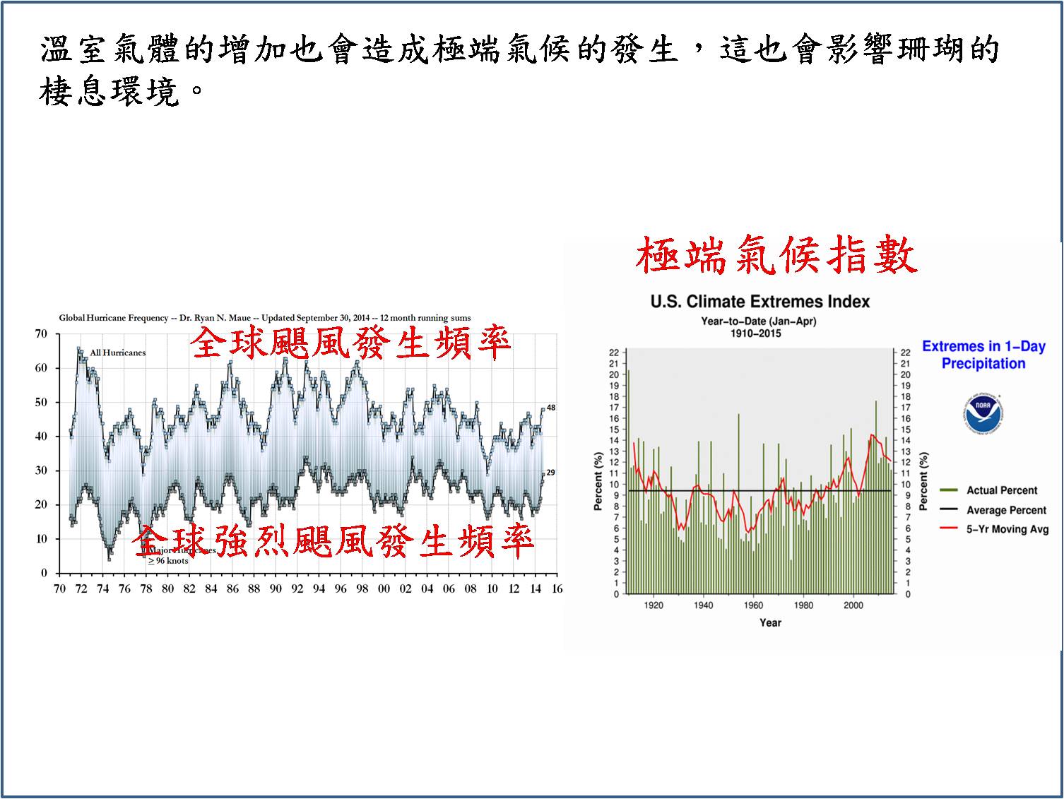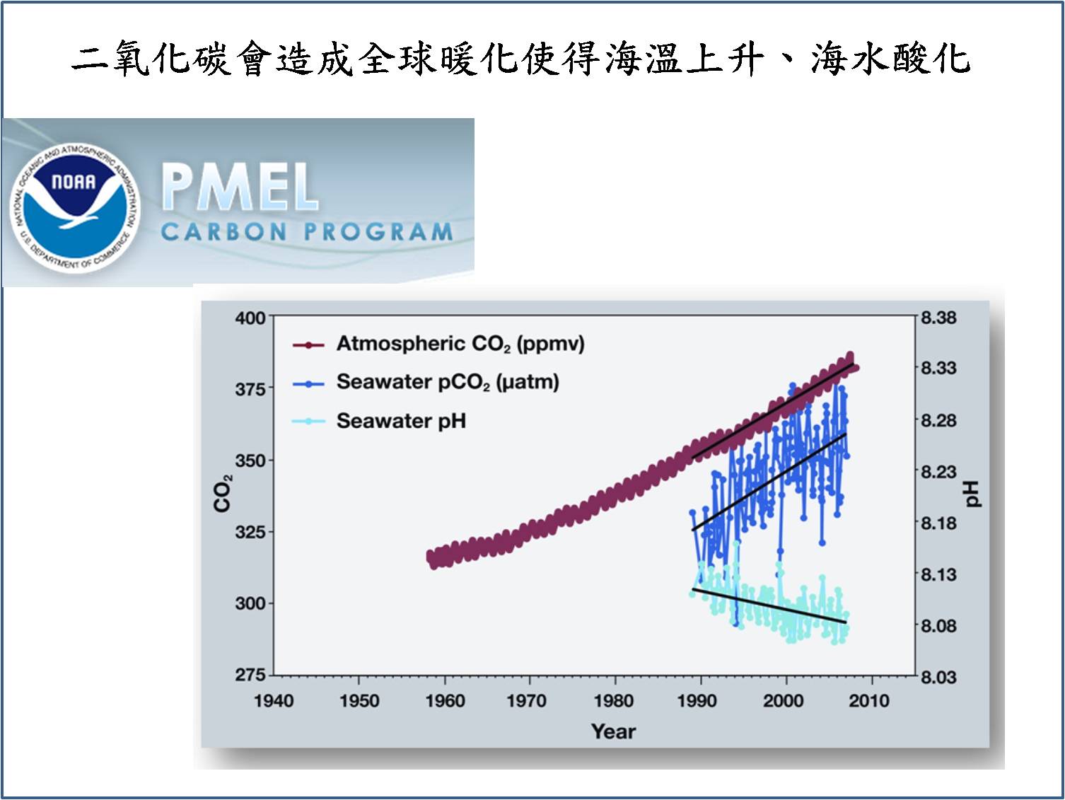 根據美國國家海洋暨大氣總署(NOAA)地球系統研究室(ESRL)的資料,隨著人類的發展尤其是工業革命開始使用化石燃料造成空氣中溫室氣體的快速累積,這些因子造成溫室效應的加劇造成全球溫度快速的上升。這些大氣因子的變化同時造成影響海洋環境,例如海水升溫, 海水酸化, 極端氣候發生率上升...等。這些不只影響人類的生活對於海洋生物也有著極大的影響,尤其是珊瑚礁生態系對於這些環境的變動特別的敏感。