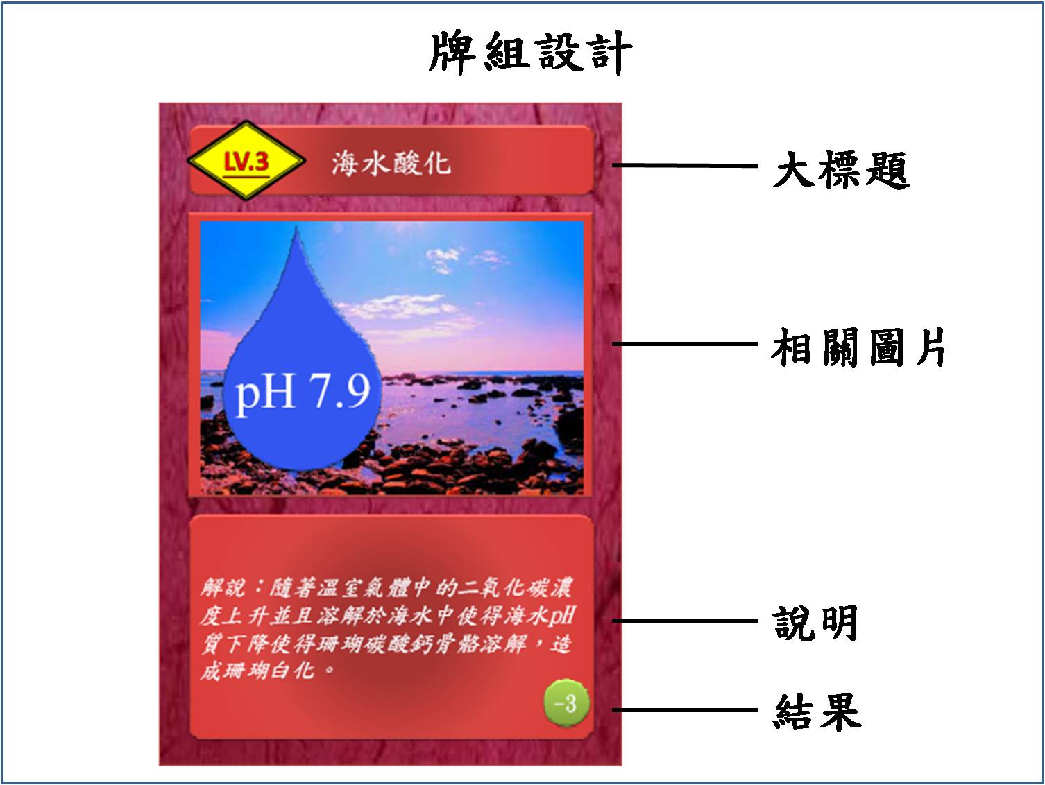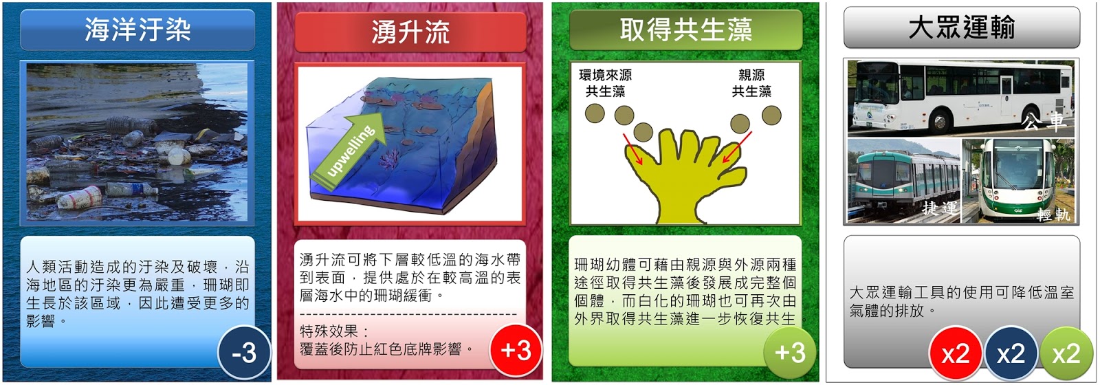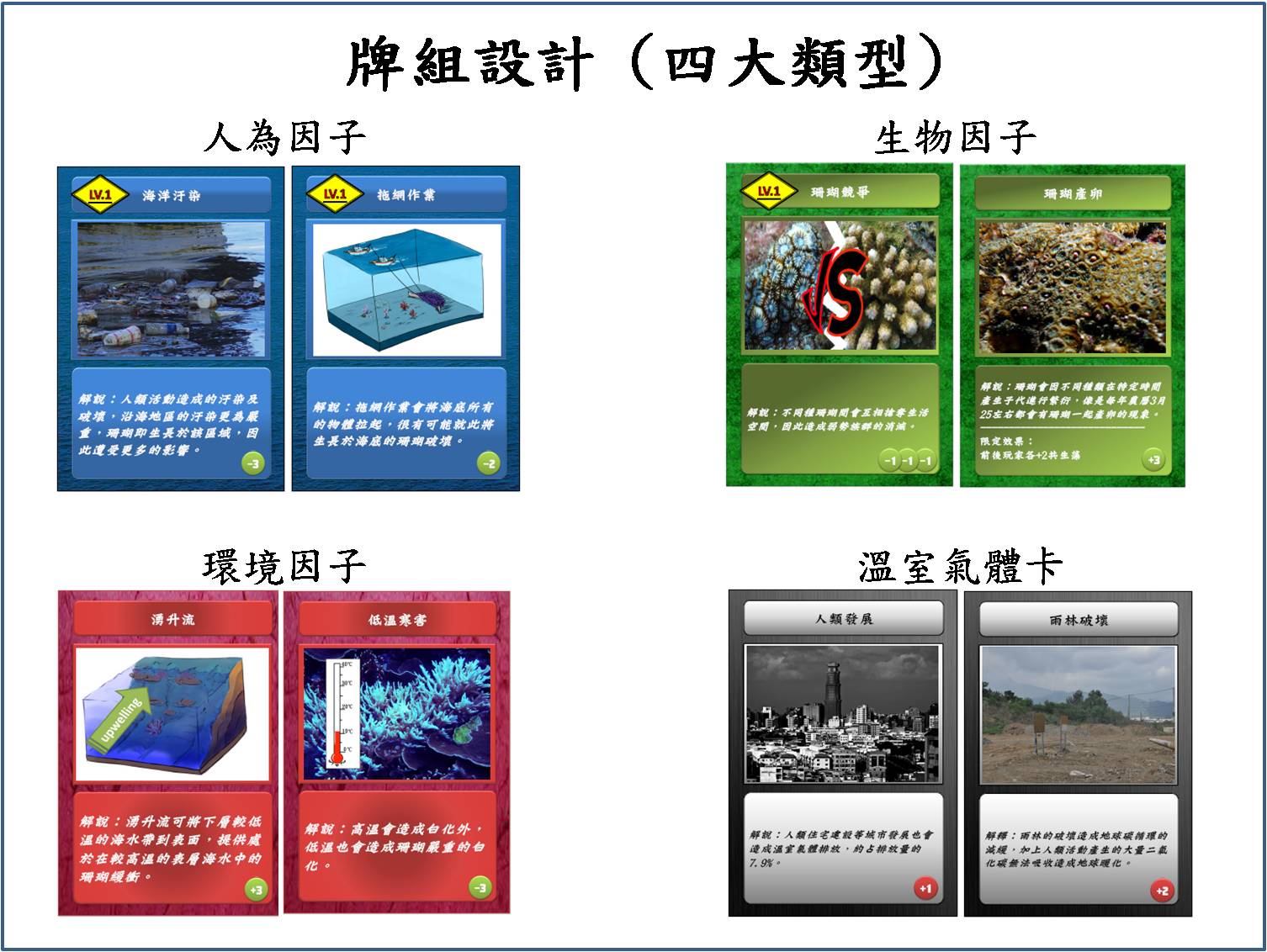 第一版的設計就是將各種不同對於珊瑚生理, 生殖和白化...等因子集合起來設計成牌卡,主要將其分成三大類型的牌組 (1) 人為因子, (2)生物因子, (3)環境因子。然後在多次的測試中加入與這些因子相關的發想設計豐富其變化。此時的卡牌中的照片也是由google上取得,屬於個人玩樂等級的作品。