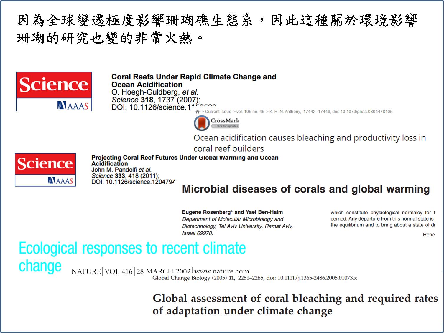 近年來也越來越多研究投如相關議題的領域,並有學者提出預言警告當溫室氣體濃度到達450-500 ppm海水升溫2度的時候珊瑚就會開始大規模的白化,如果當溫室氣體高於500 ppm這時海水溫度就會高出3度左右,這將會全面性的摧毀翻珊瑚礁生態系。